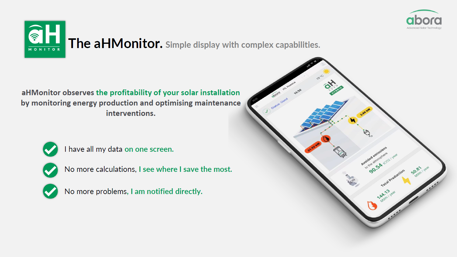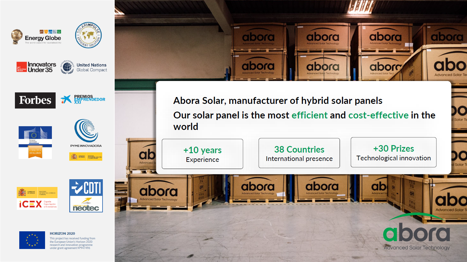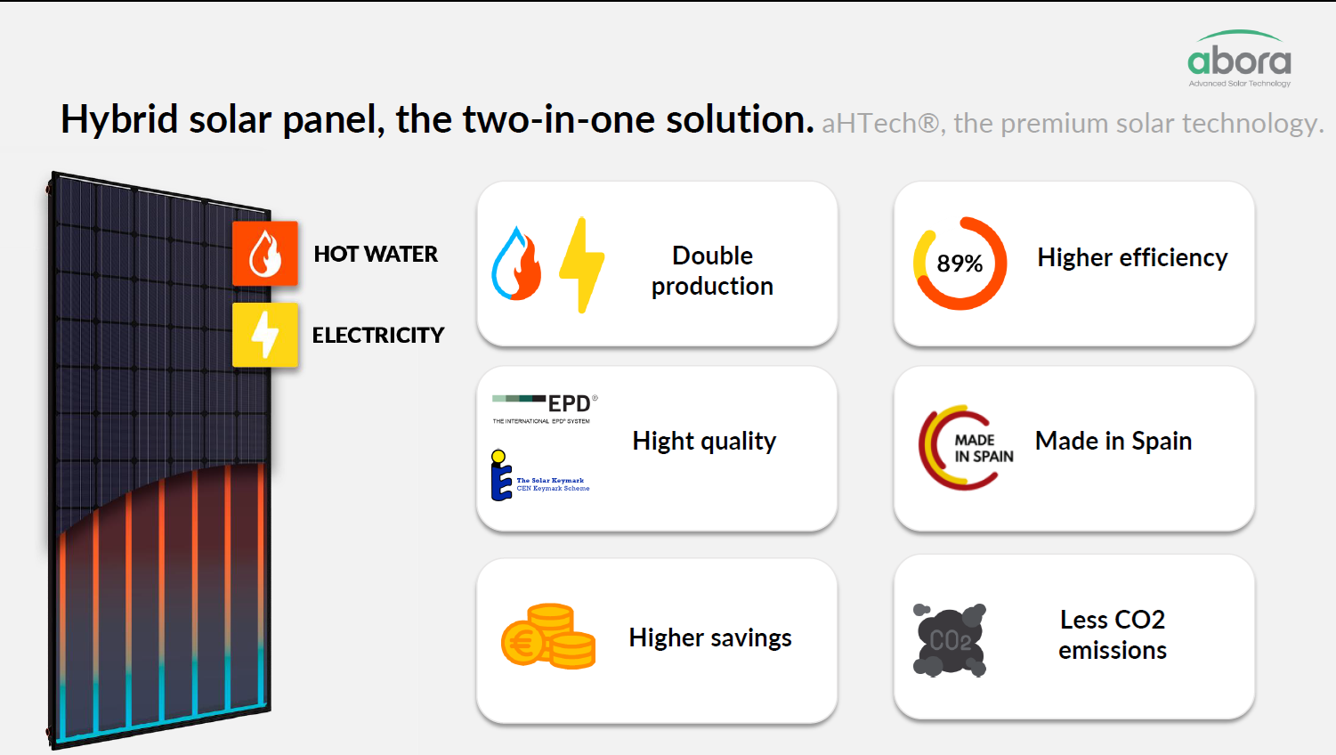 Abora Solar je španělský výrobce inovativních hybridních solárních panelů (PVT) se sídlem v Zaragoze. Společnost byla založena v roce 2017 a zaměřuje se na vývoj technologií, které umožňují současnou výrobu elektřiny i tepelné energie z jednoho solárního panelu. Díky vlastní patentované technologii aHTech® dosahují panely Abora Solar mimořádné celkové účinnosti až 89 %, což z nich činí jedny z nejefektivnějších solárních řešení na trhu.