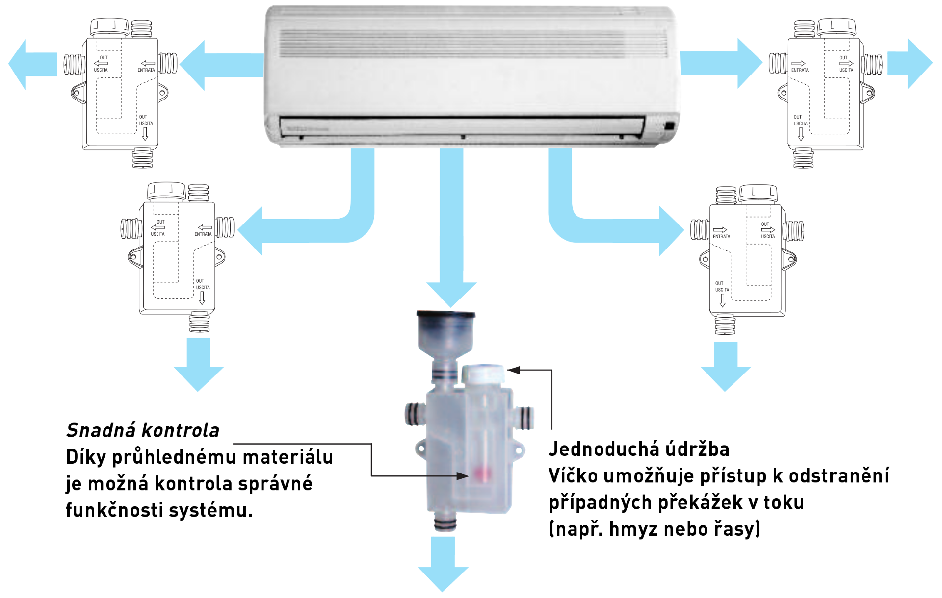- transparentní design umožňuje vizuální kontrolu nečistot
