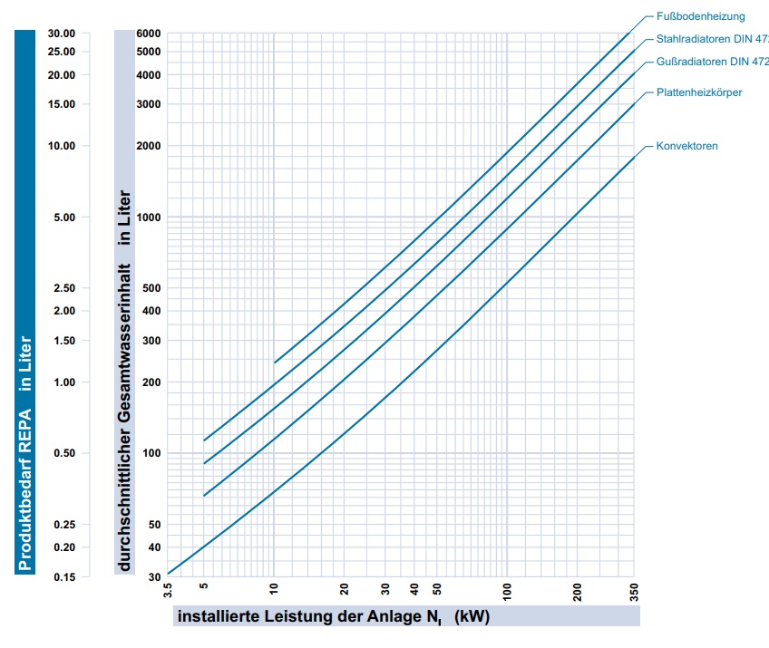 - určete objem vody v topném systému (graf)