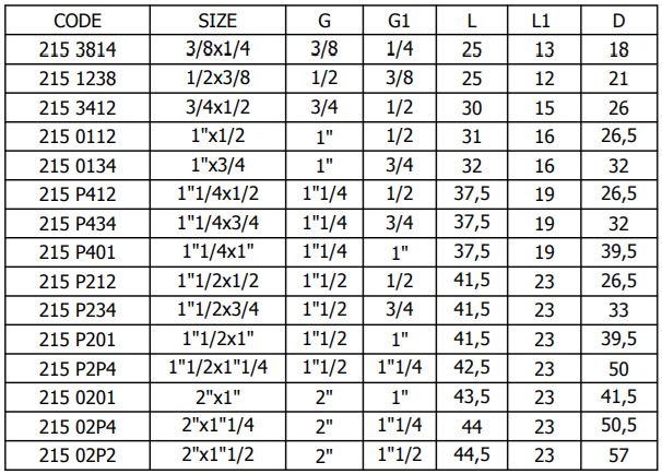 | Připojení: | 3/8"x1/4", 1/2"x3/8", 3/4"x1/2", 1"x1/2", 1"x3/4", 5/4"X3/4", 5/4"x1", 6/4"x5/4", 2"x5/4", 2"x6/4" |