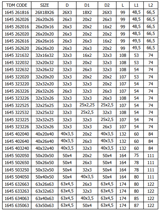 | Připojení: | 16x20x16, 18x16x16, 18x16x18, 20x16x16, 20x16x20, 20x18x18, 20x18x20, 20x20x16, 20x26x20, 26x16x20, 26x16x26, 26x18x26, 26x20x20, 26x20x26, 26x26x16, 26x26x20, 32x20x32, 32x26x26, 32x32x26, 40x32x40 |