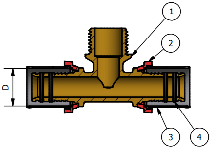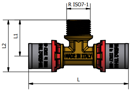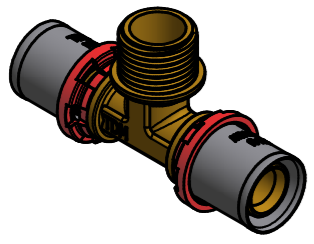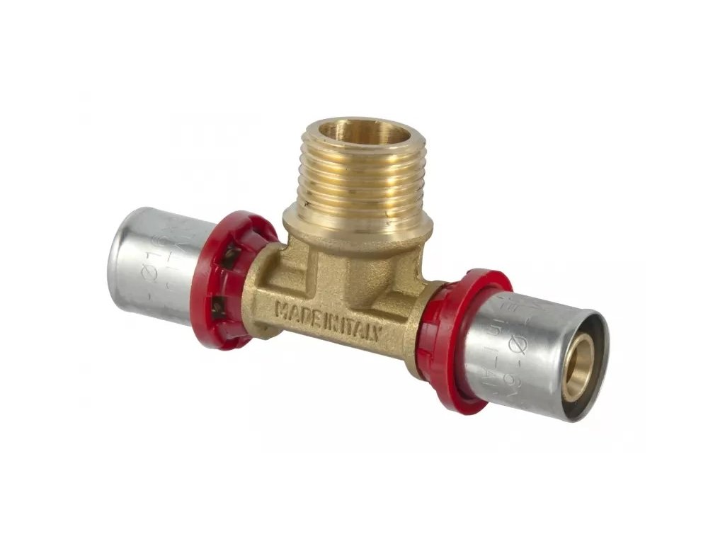 Mosazný lisovací T-kus s vnějším závitem pro pex-al-pex potrubí. Čelisti TH. Připojení 16x1/2"x16, 18x1/2"x18, 20x1/2"x20, 20x3/4"x20, 26x3/4"x20, 32x1"x32. Provozní teplota 0 °C +95 °C. Provozní tlak PN 10. Mosaz CW617N. Plastový doraz nylon 6. Krytka nerez AISI 304. Těsnící O-kroužek EPDM. Pro rozvody vody a topení. Použité těsnění splňuje normu UNI EN 681-1: 2006 (pro vodu). Vyrobeno v souladu s UNI EN ISO 9001:2015 v Itálii.