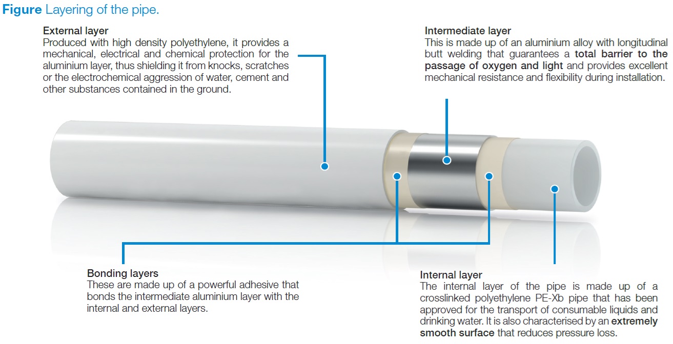 • Intermediate layer - vrstva je vyrobena z hliníkové slitiny s podélným svarem na tupo, který zaručuje úplnou bariéru pro průchod kyslíku a světla a poskytuje mechanickou odolnost a flexibilitu během instalace