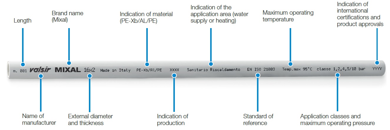 • Internal layer - vnitřní vrstva potrubí je tvořena trubkou ze síťovaného polyetylenu PE-RT, která je schválena pro přepravu spotřebních kapalin a pitné vody. Vyznačuje se také extrémně hladkým povrchem, který snižuje tlakové ztráty.