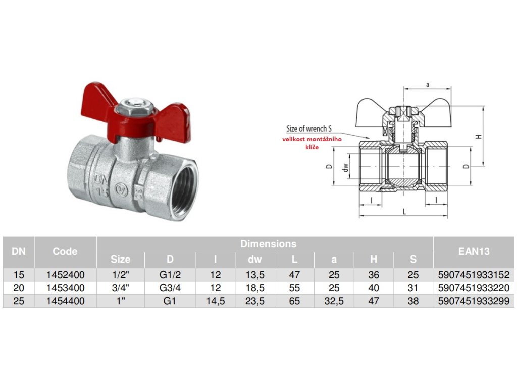 Nasaďte vidlicový klíč na šestihranný (nebo osmihranný) konec ventilu na straně potrubí (pod páčkou, při poloze otevřeno) a našroubujte ventil na přívodní potrubí. Nepoužívejte klíč na opačný konec ventilu, abyste jej našroubovali na potrubí (ne závitový spoj, je vidět na řezu níže). Podobný postup použijte při demontáži ventilu. Použití jiných než výše uvedených metod může způsobit poškození nebo netěsnost ventilu. Na utěsnění závitů použijte doporučené těsnící materiály (konopí, len, nit, teflonová páska) najdete v souvisejících produktech. Instalace (vodní systémy) bez pevných nečistot, jako je písek, vodní kámen atd. zaručí správný, bezporuchový provoz kulových kohoutů. Doporučené velikosti montážních klíčů najdete v rozměrových tabulkách níže.