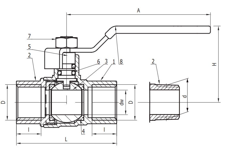 1 tělo ventilu, 2 matice těla ventilu, 3 koule, 4 těsnění koule, vřeteno, 6 těsnění vřetene, 7 matice/šroub, páčka