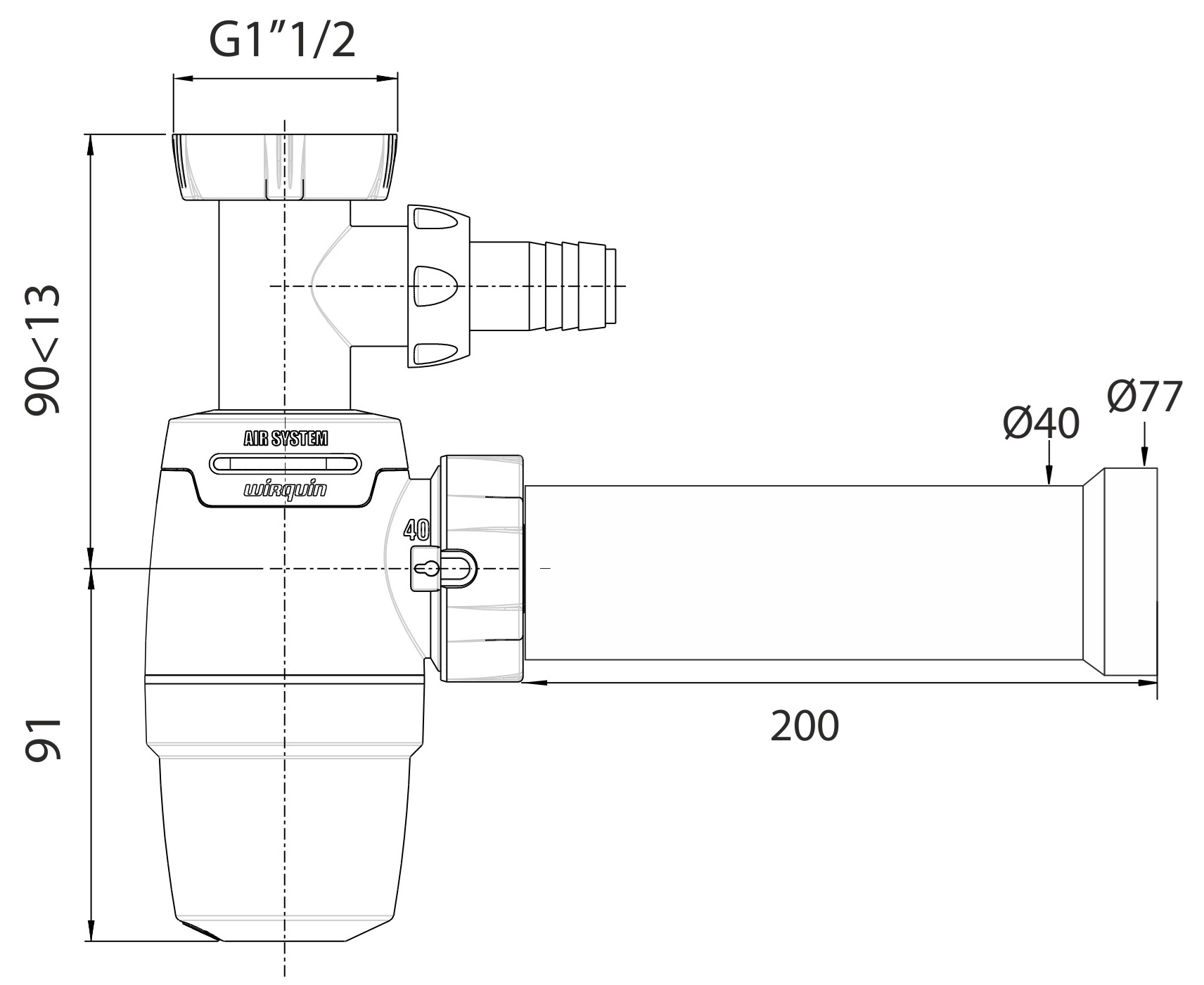 WIRQUIN NEO AIR DN 40 přivzdušňovací sifon pro dřez s připojením na myčku/pračku